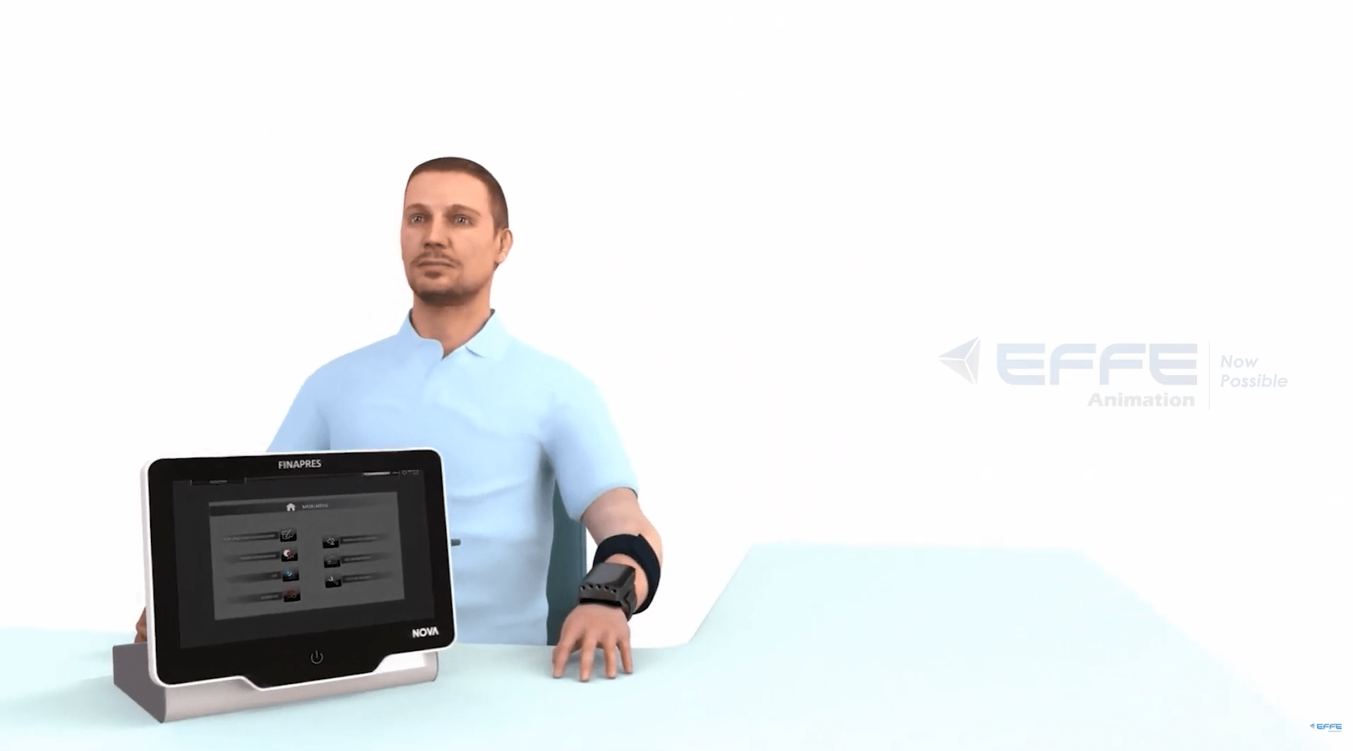 EFFE Animation developed a detailed 3D tutorial highlighting how a blood pressure monitor functions within the category of monitoring devices. The animation illustrated the cuff inflation process, oscillometric measurement technique, and digital display interpretation.